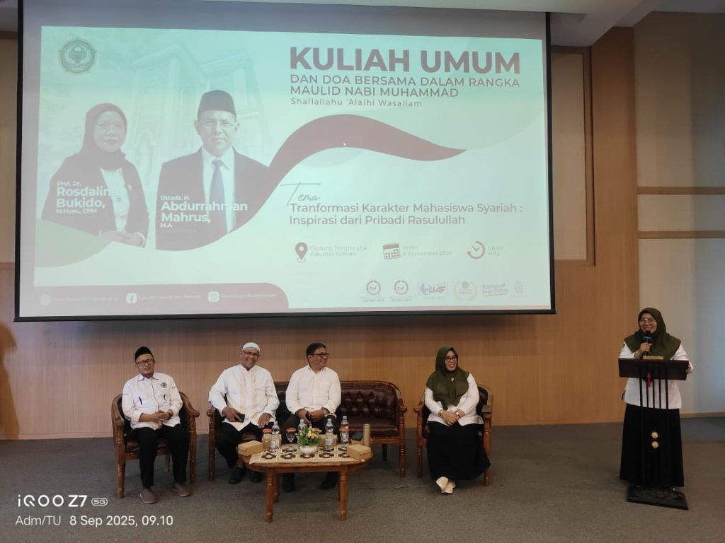 Dalam rangka memperingati Maulid Nabi Muhammad SAW, Fakultas Syariah menyelenggarakan Kuliah Umum dan Doa Bersama pada hari ini bertempat di Aula Theatre lantai 4 Fakultas Syariah. Kegiatan ini mengusung tema “Transformasi Karakter Mahasiswa Syariah: Inspirasi dari Pribadi Rasulullah.”