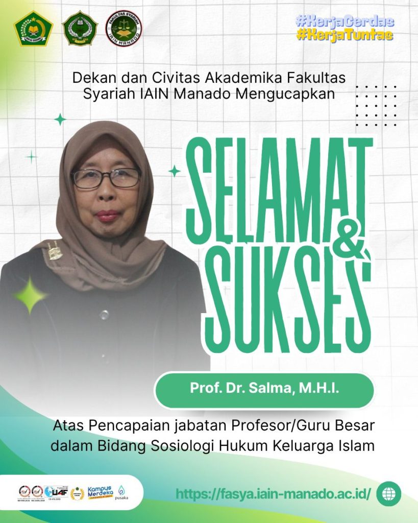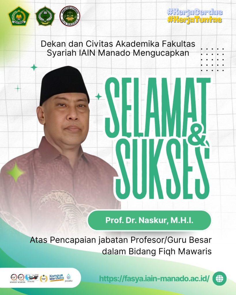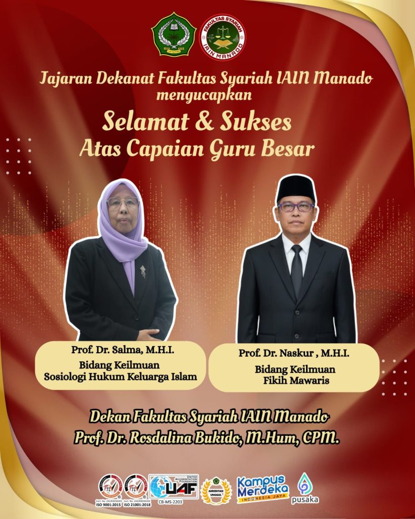 Manado, Oktober 2025 – Fakultas Syariah IAIN Manado kembali menorehkan prestasi gemilang di dunia akademik. Dua dosen terbaik, yakni Prof. Dr. Naskur, M.H.I. dan Prof. Dr. Salma, M.H.I., resmi meraih jabatan Profesor/Guru Besar, masing-masing dalam bidang Fiqh Mawaris dan Sosiologi Hukum Keluarga Islam.